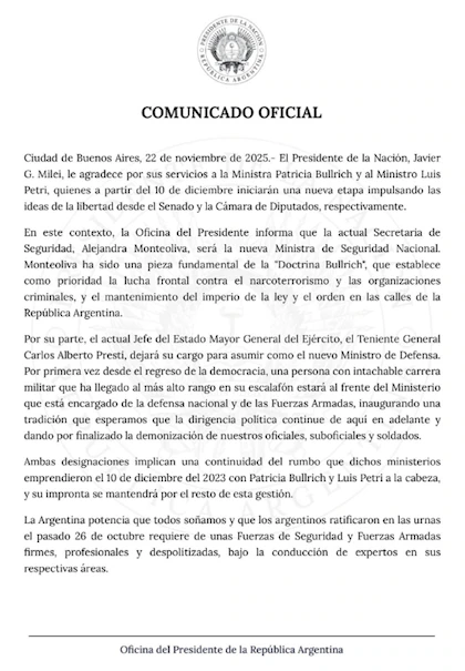 La confirmación fue difundida simultáneamente por Bullrich, Petri y la Oficina del Presidente a través de la red social X. En el comunicado oficial, se destacó que el presidente Javier G. Milei agradece a Bullrich y Petri por sus servicios y subrayó que ambos iniciarán una "nueva etapa impulsando las ideas de la libertad desde el Senado y la Cámara de Diputados".
