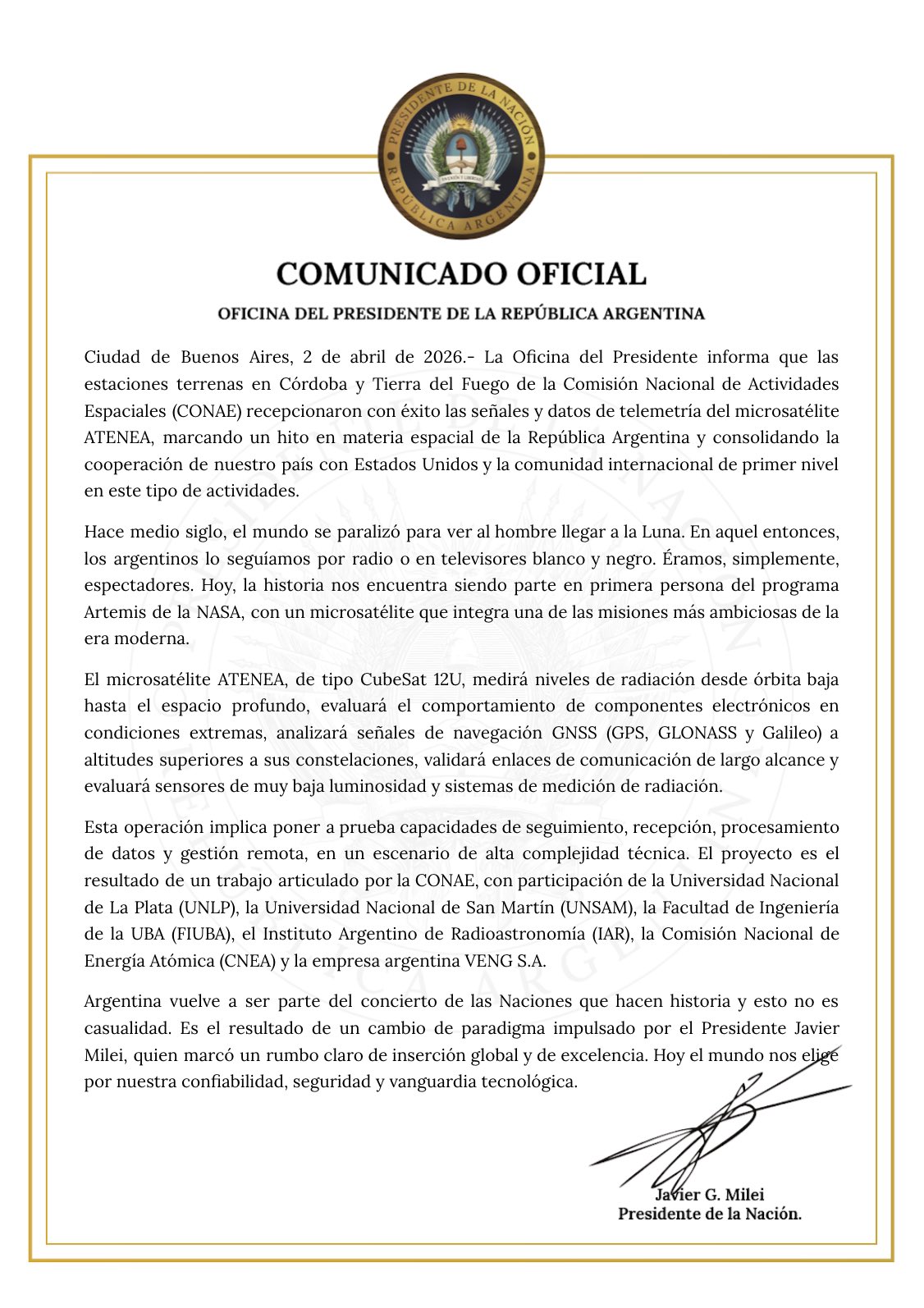 La señal y los datos de telemetría del microsatélite ATENEA fueron recibidos con éxito por las estaciones terrenas en Córdoba y Tierra del Fuego”, destacó la Oficina del Presidente en un comunicado. “Se trata de un hito en materia espacial de la República Argentina, consolidando nuestra cooperación con Estados Unidos y con la comunidad internacional de primer nivel en este tipo de actividades”, agregaron.