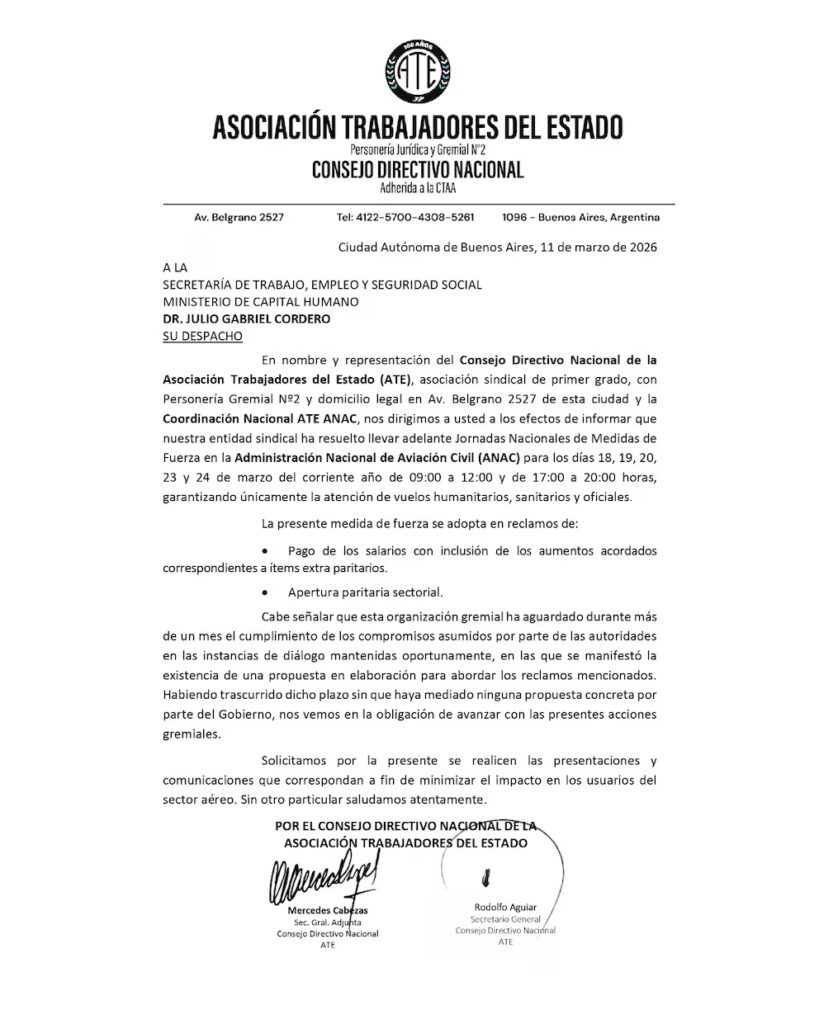 La Asociación de Trabajadores del Estado (ATE) confirmó un paro nacional que impactará directamente en la actividad aérea. Desde el lunes 18 de marzo y hasta el 24 de marzo, más de 27 aeropuertos del país verán interrumpidas sus operaciones en dos franjas horarias: de 9 a 12 y de 17 a 20.