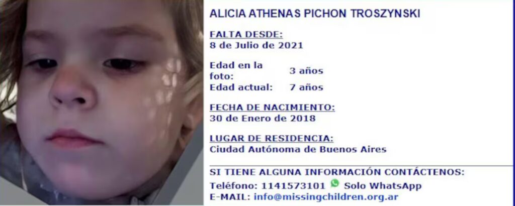 La desaparición de Alicia se produjo en julio de 2021. A pesar de la intervención de organismos especializados como Missing Children, la difusión de imágenes y la activación de una alerta amarilla de Interpol, hasta el momento no se registraron pistas firmes sobre su paradero.
