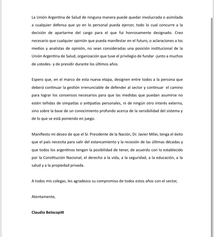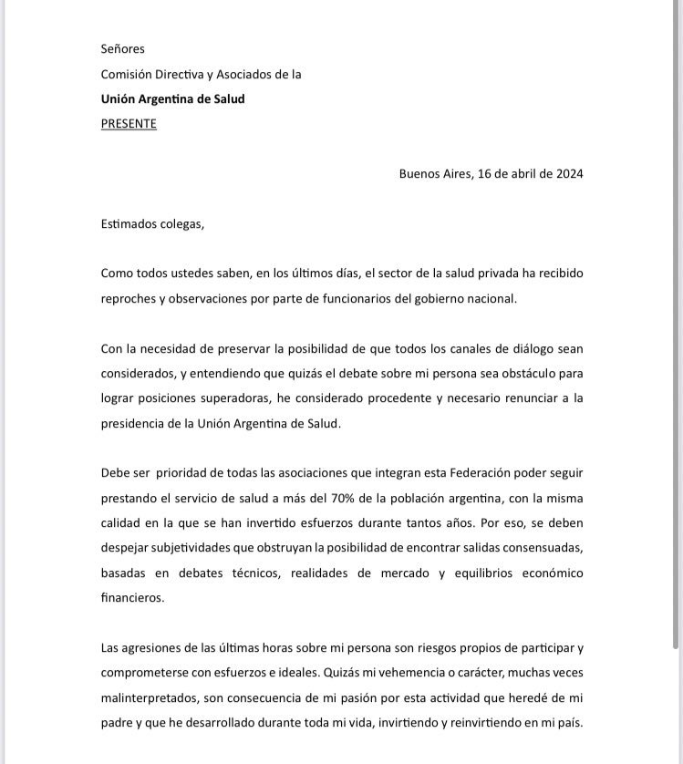 "Con la necesidad de preservar la posibilidad de que todos los canales de diálogo sean considerados, y entendiendo que quizás el debate sobre mi persona sea obstáculo para lograr posiciones superadoras, he considerado procedente y necesario renunciar a la presidencia de la Unión Argentina de Salud”, continuó.