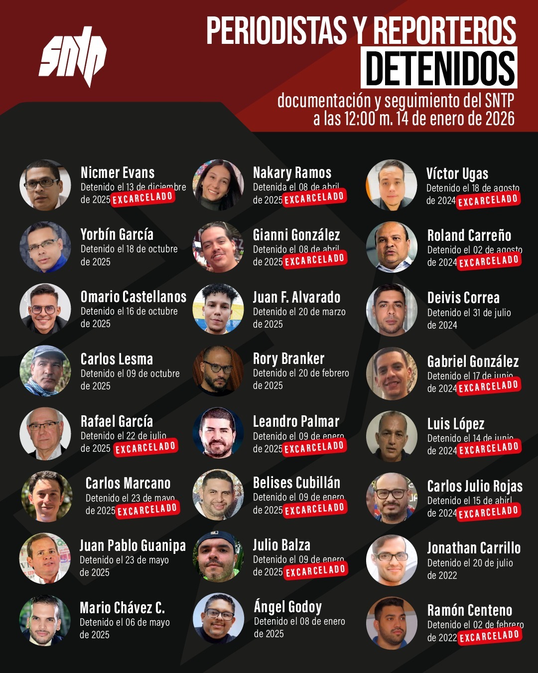 Los primeros nombres difundidos fueron Belises Cubillán Fuenmayor, Ramón de Jesús Centeno Navas, Víctor Ugas Azócar y Carlos Marcano Mogollón, todos vinculados a tareas periodísticas y detenidos durante el régimen chavista.