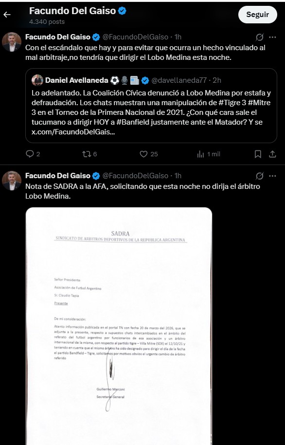 De acuerdo con lo expresado por del Gaiso en la denuncia, “Luis Lobo Medina, árbitro de fútbol, designado por la Asociación de Fútbol Argentino para dirigir distintos partidos en la Primera Nacional, que es la segunda división del fútbol local, habría manipulado el resultado del partido que dirigió el 12 de octubre de 2021 entre Tigre y Mitre de Santiago del Estero”. Sin embargo y a pesar de la supuesta ayuda arbitral, el encuentro finalizó empatado, aunque el equipo santiagueño sufrió una insólita expulsión y un penal inventado, ya que no se produjo ninguna falta dentro del área.