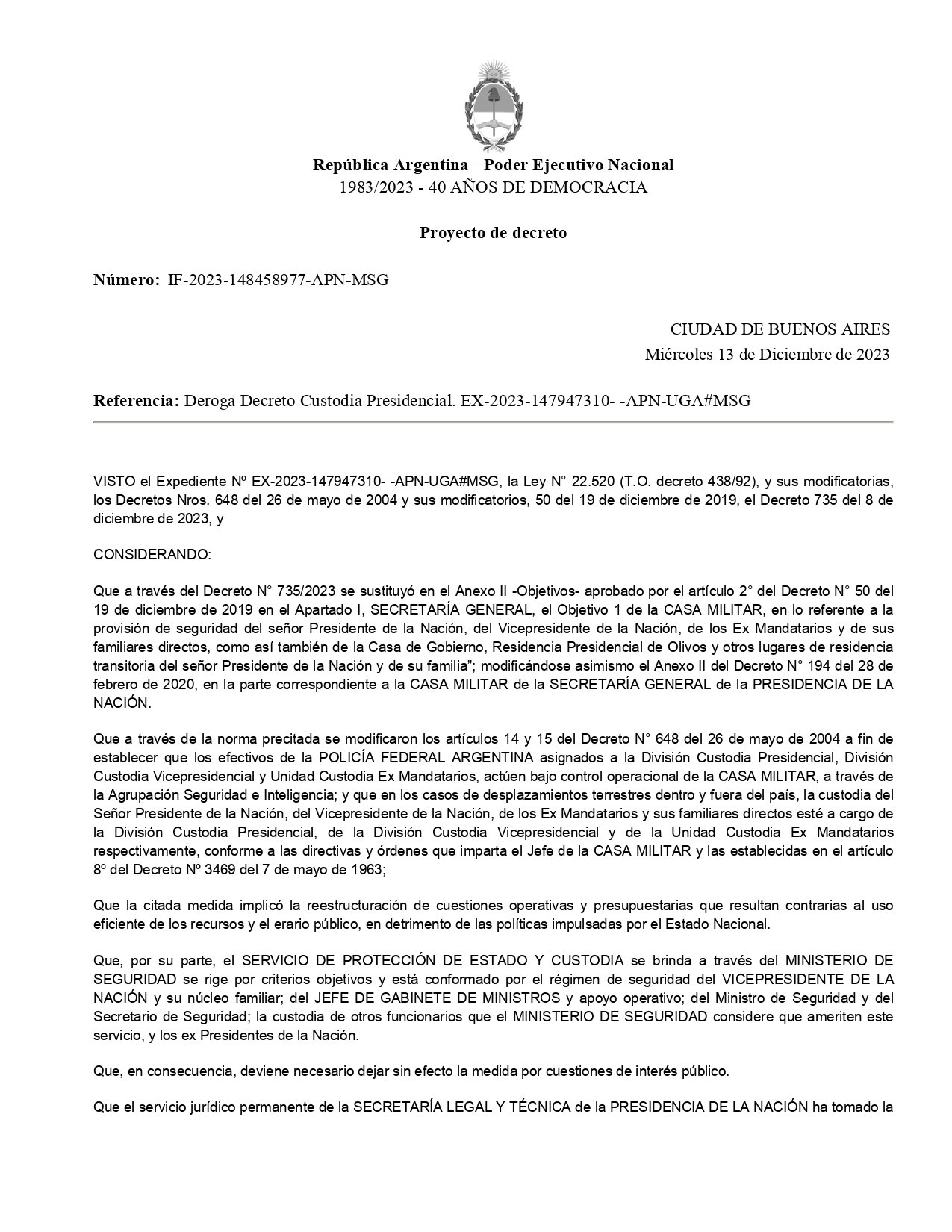 Esta tarde, el Ministerio de Seguridad que encabeza Patricia Bullrich informó que queda derogado el último decreto firmado por el ex presidente Alberto Fernández, donde se establecía que los ex mandatarios y sus familiares podrían mantener su custodia de por vida y en el exterior: "Mediante Decreto IF-2023-148458977-APNMSG, se derogó el Decreto N°735 del día 8 de diciembre de 2023 firmado por el ex presidente Alberto Fernández, que determinaba la obligatoriedad del Estado argentino de brindarle custodia tanto a él como a sus familiares directos, aun viviendo en el exterior", se detalló.