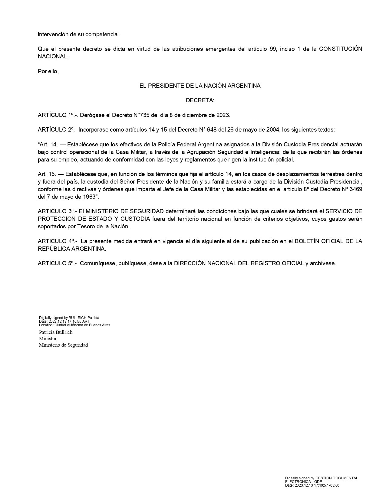 Horas más tarde, se dio a conocer el decreto que firmó el presidente Javier Milei y la ministra Bullrich. En el mismo también se detalló que la cartera de Seguridad "determinará las condiciones bajo las cuales se brindará el servicio de protección de estado y custodia fuera del territorio nacional en función de criterios objetivos, cuyos gastos serán soportados por el Tesoro de la Nación".