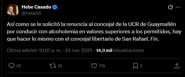 Sin ir más lejos, la propia vicegobernadora de Mendoza, Hebe Casado se manifestó en sus cuentas de redes sociales y escribió que “así como se le solicitó la renuncia al concejal de la UCR de Guaymallén por conducir con alcoholemia en valores superiores a los permitidos, hay que hacer lo mismo con el concejal libertario de San Rafael. Fin”.