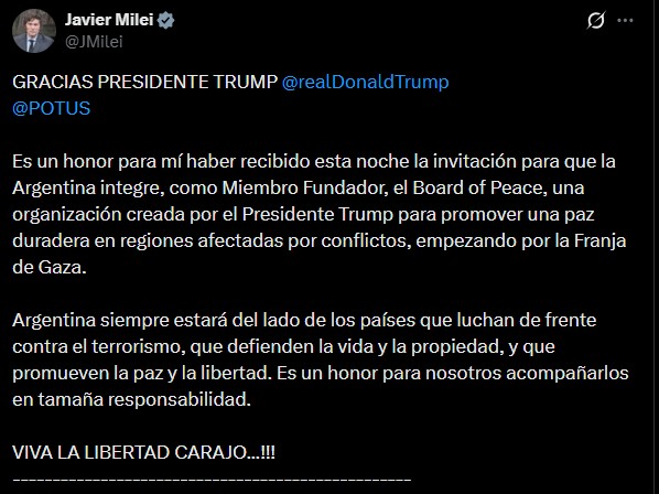 A través de su cuenta en la red social X (exTwitter), Javier Milei agradeció el convite a su par estadounidense y remarcó que "es un honor para mí haber recibido esta noche la invitación para que la Argentina integre, como Miembro Fundador, el Board of Peace, una organización creada por el Presidente Trump para promover una paz duradera en regiones afectadas por conflictos, empezando por la Franja de Gaza".