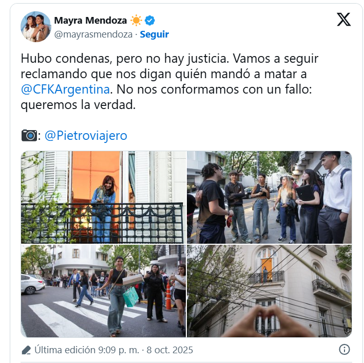 Por su parte, la intendenta de Quilmes fue una de las voces más críticas en redes sociales. En su cuenta de X, afirmó que “el pacto de injusticia garantizado por el Partido Judicial y esta banda de mafiosos no puede quedar impune”, mencionando además a Patricia Bullrich, Mauricio Macri y Luis Caputo. La intendenta sostuvo que el fallo “no refleja el reclamo de justicia de millones de argentinos” y evidencia “la protección que el Poder Judicial otorga a los sectores del poder político y mediático”. Mendoza finalizó con una pregunta que resonó ampliamente: “¿Quién mandó a matar a Cristina?”.