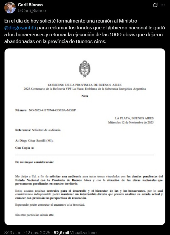En su cuenta de la red social X (exTwitter), Bianco aseguró que "en el día de hoy solicité formalmente una reunión al Ministro @diegosantilli para reclamar los fondos que el gobierno nacional le quitó a los bonaerenses y retomar la ejecución de las 1000 obras que dejaron abandonadas en la provincia de Buenos Aires".