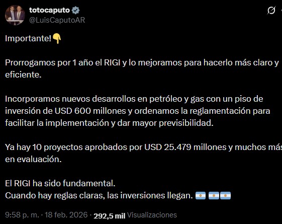 Caputo, dio la noticia a través de un escueto mensaje, donde adelantó que el régimen sufrió modificaciones con el objetivo de facilitar la llegada de inversiones. En ese sentido, escribió que "prorrogamos por 1 año el RIGI y lo mejoramos para hacerlo más claro y eficiente".