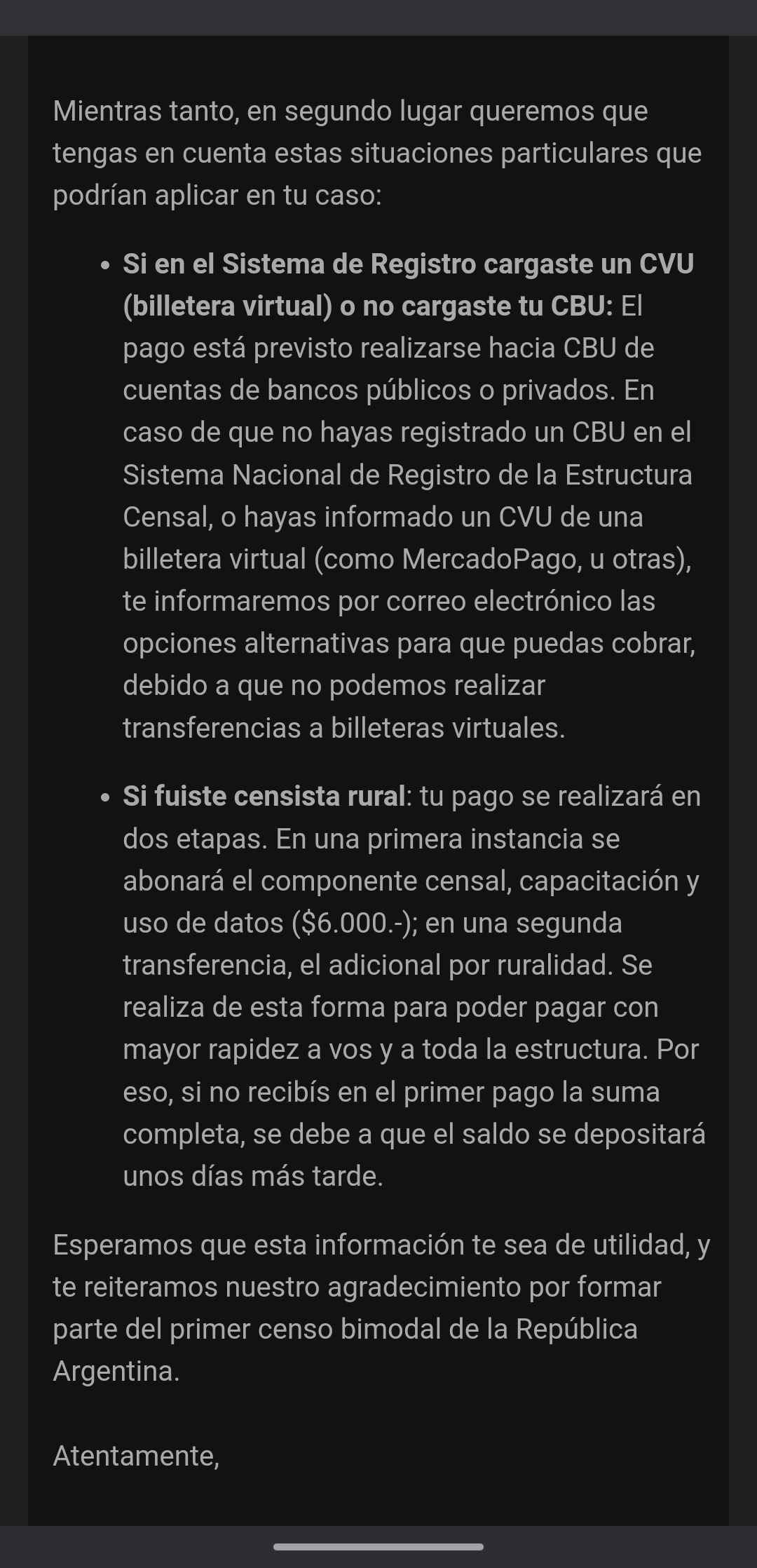 De forma inaudita, el mismo mensaje escribe que los censistas rurales cobrarán su salario en dos etapas: 6 mil en primera instancia por todas las labores realizadas, incluso la capacitación. Por otro lado, INDEC pagara el monto extra por ruralidad en otra transferencia. El motivo esbozado es una "mayor rapidez" en el trámite.