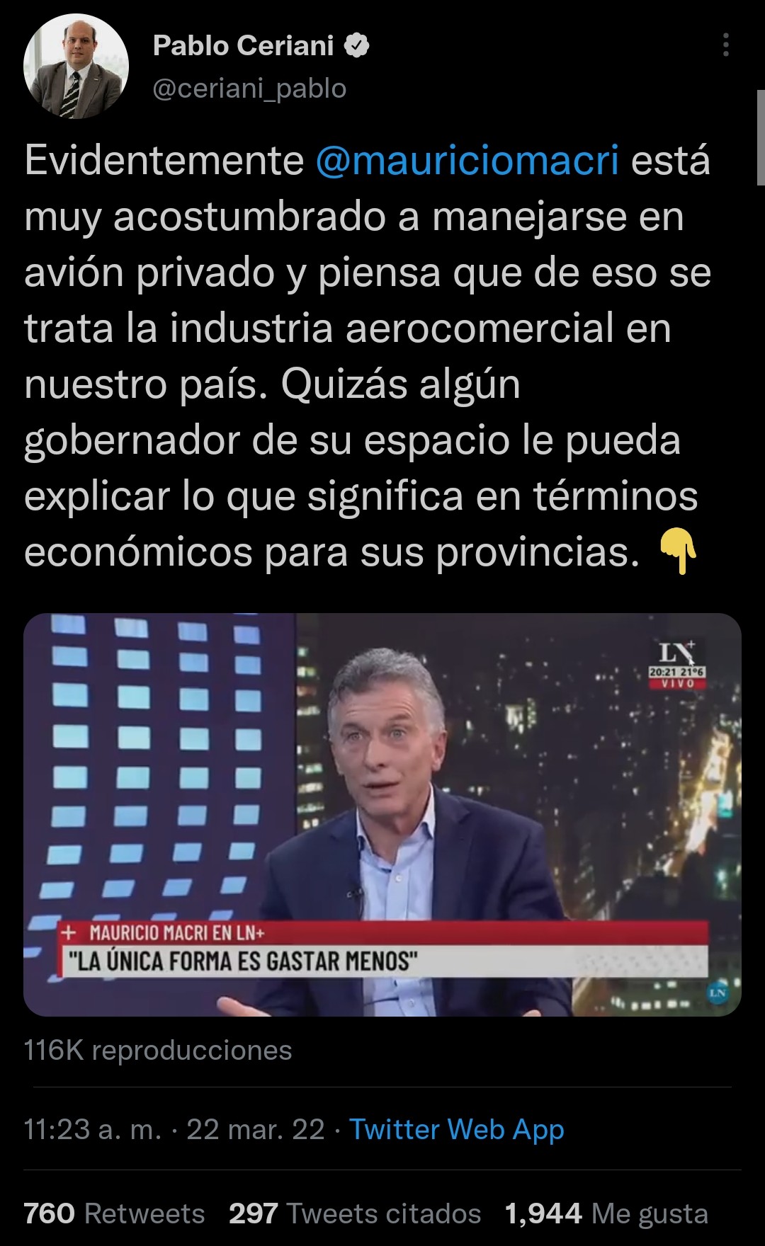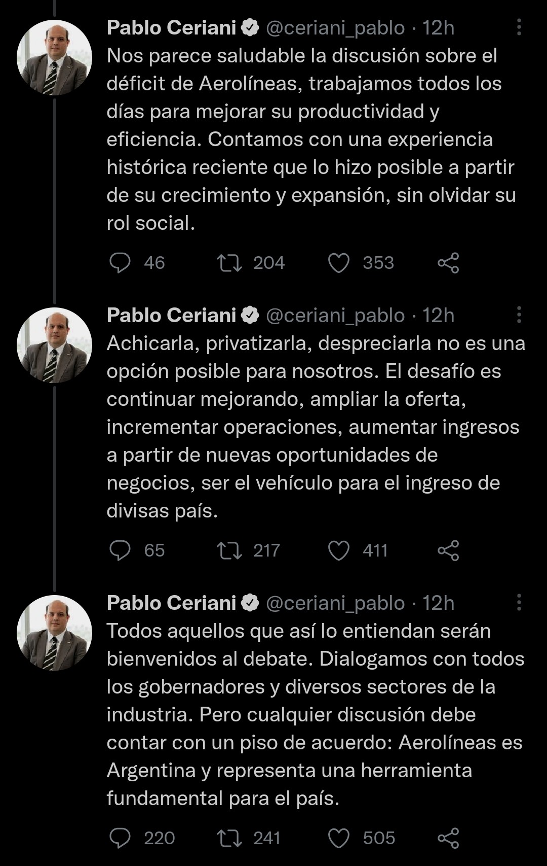 Tras los comentarios de Macri en la entrevista para LN+, el titular escribió un duro hilo en Twitter contra el exmandatario. "Evidentemente, Mauricio Macri está muy acostumbrado a manejarse en avión privado y piensa que de eso se trata la industria aerocomercial en nuestro país. Quizás algún gobernador de su espacio le pueda explicar lo que significa en términos económicos para sus provincias", comenzó Ceriani.