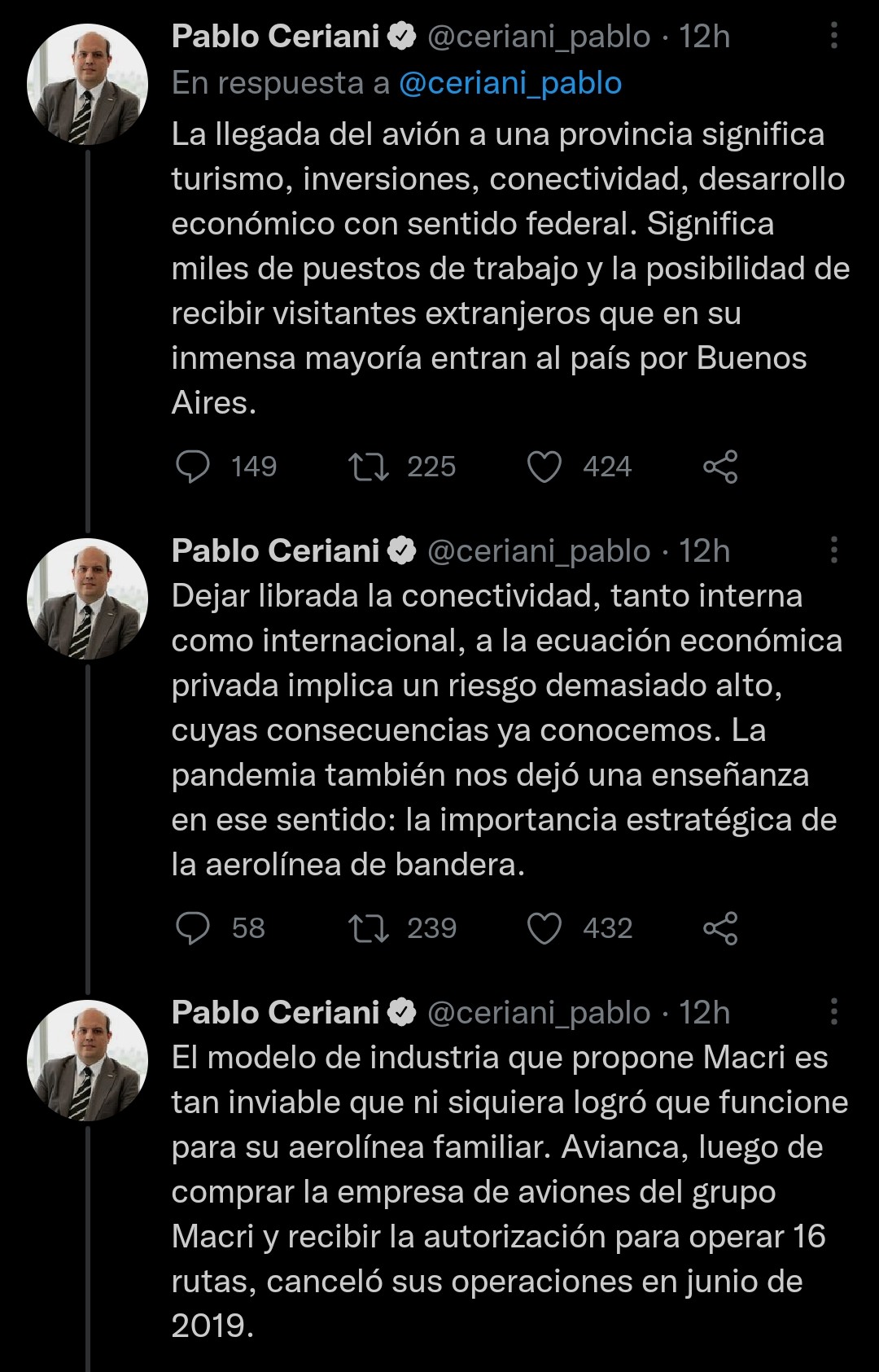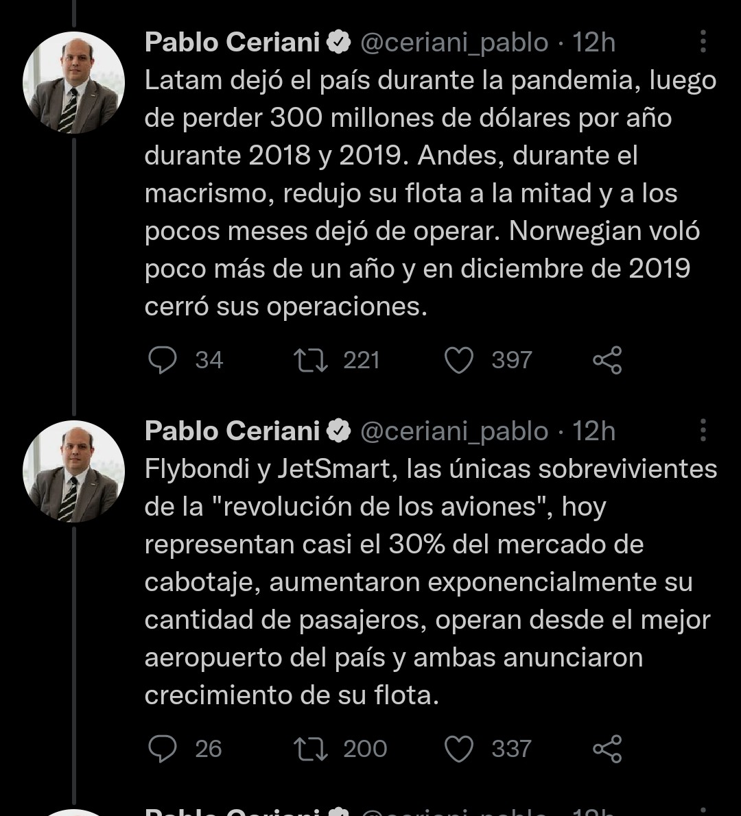 En respuesta a esto, Ceriani dijo que "el modelo de industria que propone Macri es tan inviable que ni siquiera logró que funcione para su aerolínea familiar. Avianca, luego de comprar la empresa de aviones del grupo Macri y recibir la autorización para operar 16 rutas, canceló sus operaciones en junio de 2019", y empezó a enumerar casos de otras aerolíneas que ya no operan en Argentina, como LATAM, que dejó el país durante la pandemia.