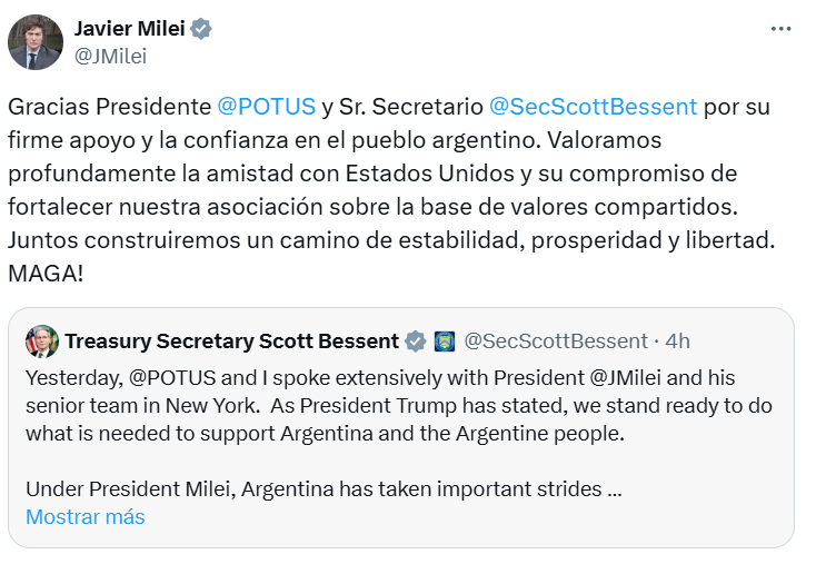 “Gracias presidente Donald Trump y señor secretario Scott Bessent por su firme apoyo y la confianza en el pueblo argentino”, escribió Milei, quien destacó que ambos países comparten valores comunes. Desde Nueva York, donde participó de la bilateral, insistió: “Valoramos profundamente la amistad con Estados Unidos y su compromiso de fortalecer nuestra asociación sobre la base de valores compartidos”.
