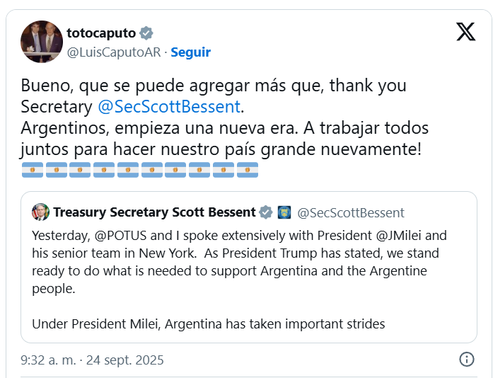 "Bueno, que se puede agregar más que, thank you Secretary @SecScottBessent. Argentinos, empieza una nueva era. A trabajar todos juntos para hacer nuestro país grande nuevamente!", festejó Luis Caputo.