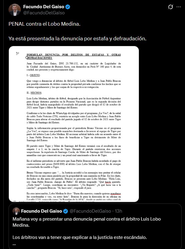 El escandaloso chat da a entender que un partido que se disputó entre Tigre y Mitre durante el torneo de la B Nacional en 2021 podría haber estado arreglado de antemano. Por si fuera poco, ese encuentro tuvo episodios escandalosos que terminaron con un jugador del equipo santiagueño injustamente expulsado y un penal por una falta inexistente a favor del club del norte del conurbano bonaerense, cuando restaban pocos minutos para la finalización del mismo. A pesar de que Lobo Medina intentó inclinar la cancha para beneficiar al conjunto "matador", el match terminó empatado 3 a 3.