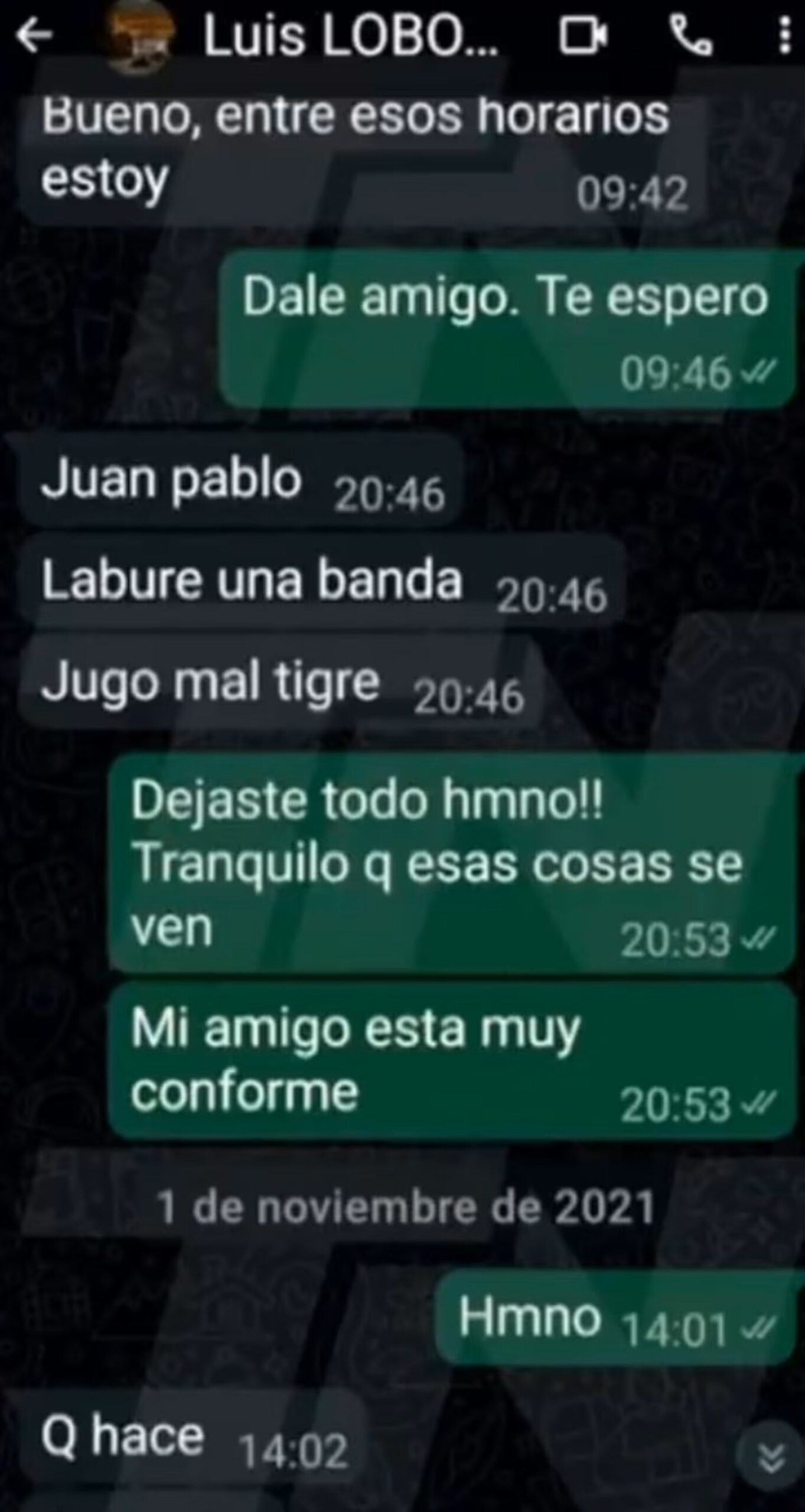 Tras finalizar el encuentro, las palabras del chat dan a entender que Lobo Medina no habría podido influenciar demasiado para que Tigre se lleve el triunfo y eso quedó plasmado en otra conversación donde el árbitro le escribe: "Juan Pablo. Laburé una banda. Jugó mal Tigre” y Beacon le contesta: “Dejaste todo, hermano. Tranquilo que esas cosas se ven. Mi amigo está muy conforme”, le contesta.