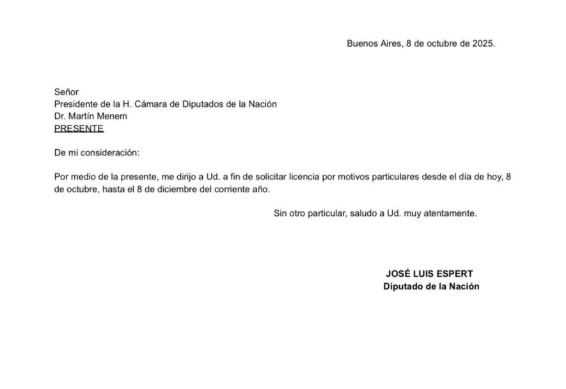 A través de un escueto mensaje dirigido al presidente de la Cámara de Diputados Martín Menem, quien era el primero en la lista para renovar su banca por La Libertad Avanza en las elecciones del 26 de octubre, señaló que solicita tomar licencia por "motivos particulares desde el día de hoy 8 de octubre, hasta el 8 de diciembre del corriente año".