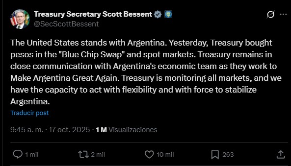 Además, escribió que "el Tesoro se mantiene en estrecha comunicación con el equipo económico argentino mientras trabaja para que Argentina vuelva a ser grande" y añadió que "el Tesoro está monitoreando todos los mercados y tenemos la capacidad de actuar con flexibilidad y contundencia para estabilizar a Argentina", subrayó.