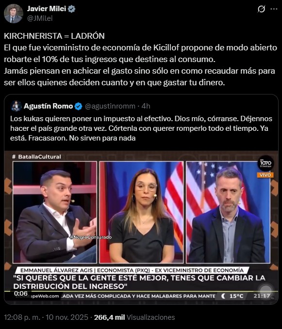 Allí Milei puso: “KIRCHNERISTA = LADRÓN. El que fue viceministro de economía de Kicillof propone de modo abierto robarte el 10% de tus ingresos que destines al consumo. Jamás piensan en achicar el gasto sino sólo en cómo recaudar más para ser ellos quienes deciden cuánto y en qué gastar tu dinero”.