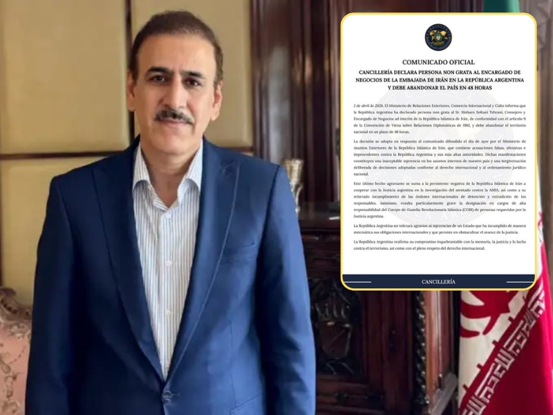 El Gobierno argentino declaró persona non grata a Mohsen Soltani Tehrani, encargado de negocios de la Embajada de Irán, y le exigió abandonar el país en un plazo de 48 horas, en un gesto que eleva la tensión con Teherán.