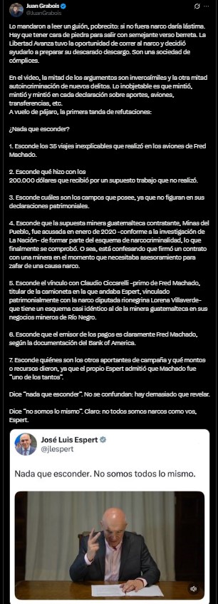 Además, Grabois enumeró lo que, según el, Espert no dijo en el video, entre los que menciona varios puntos como "los 35 viajes inexplicables que realizó en los aviones de Fred Machado" y "qué hizo con los 200.000 dólares que recibió por un supuesto trabajo que no realizó".