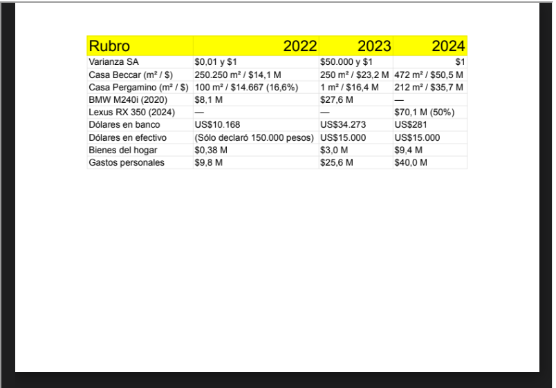 En cuanto a los bienes inmuebles, también se observaron variaciones llamativas. La superficie de su vivienda en Beccar pasó de 250 m² en 2023 a 472 m² en 2024. Por otro lado, una propiedad en Pergamino registró cambios significativos: de 100 m² en 2022 a solo 1 m² en 2023 y luego 212 m² en 2024, cifras que no explican claramente el motivo de esos ajustes.