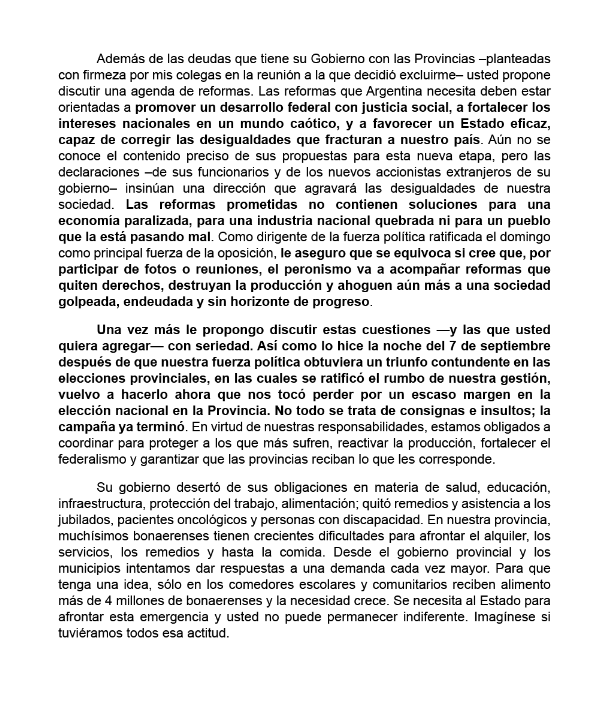 Finalmente, el gobernador advirtió que "los argentinos la están pasando mal" debido a una política económica que está destruyendo el tejido social y productivo del país, y le hizo un llamado a corregir el rumbo. "Por eso le pido que escuche, que corrija, que dialogue. No con los mercados, sino con la gente. No con los poderosos de afuera, sino con los trabajadores, los empresarios y los gobernadores de su propio país. El futuro de la Argentina no se construye con odio ni sometimiento, sino con respeto, cooperación y amor a la Patria", concluyó.