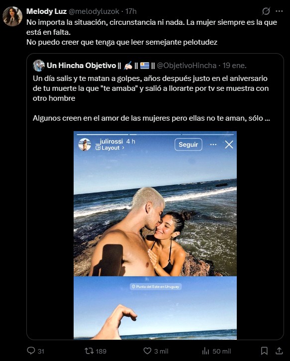 Al cumplirse seis años de la muerte del joven, Rossi subió una historia de Instagram en Punta del Este, donde se la podía ver en foto junto a su actual pareja y recibió una catarata de críticas, aunque también hubo quienes apoyaron la decisión de la chica de "rehacer su vida", aunque algunos aseguraron que la fecha en la decidió realizar la publicación fue "desafortunada".