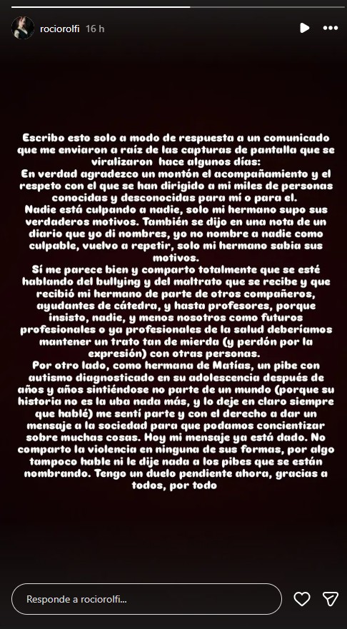 Un nuevo posteo de Rocío Rolfi, la hermana de Matías, el estudiante de la Facultad de Medicina de la UBA que se suicidó dentro del edificio de la calle Uriburu a principios de noviembre tras no soportar el acoso y bullying que sufría, volvió a referirse al episodio u aseguró tener "un duelo pendiente".