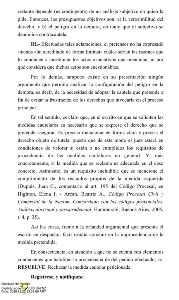 Respecto a los motivos de la resolución, en el documento, se lee: "El pretensor no ha expresado -menos aún acreditado de forma liminar- cuáles serían las razones que lo conducen a cuestionar los actos asociativos que menciona, ni por qué considera que dichos actos son cuestionables".