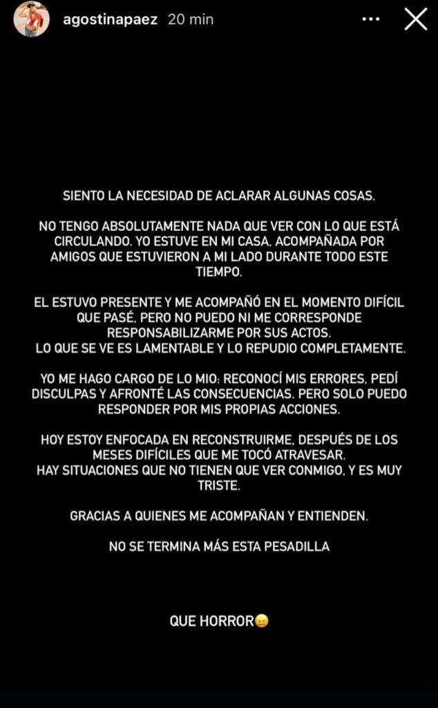 Ante la repercusión, la joven de 29 años utilizó sus redes sociales para aclarar que no está vinculada con ese comportamiento y explicó que, desde la llegada a su provincia natal, estuvo acompañada por amigos.