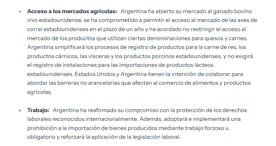 La Casa Blanca dio a conocer los puntos clave del nuevo pacto, que busca impulsar el crecimiento, ampliar oportunidades y crear un entorno transparente para el comercio y la innovación entre ambas naciones. Sin embargo, los párrafos publicados por la institución norteamericana son claramente beneficiosos para el propio país y se limitan a indicar que debe hacer Argentina, mencionando poco sus compromisos comerciales, luego de varias protestas por parte de los productores norteamericanos.