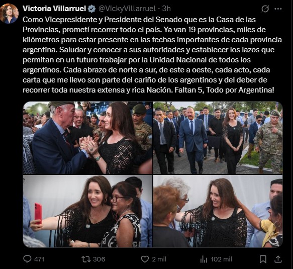 En sus redes sociales, la vicepresidenta defendió su presencia en Formosa y, en su cuenta de la red social X (exTwitter) señaló que "como Vicepresidente y Presidente del Senado que es la Casa de las Provincias, prometí recorrer todo el país. Ya van 19 provincias, miles de kilómetros para estar presente en las fechas importantes de cada provincia argentina".