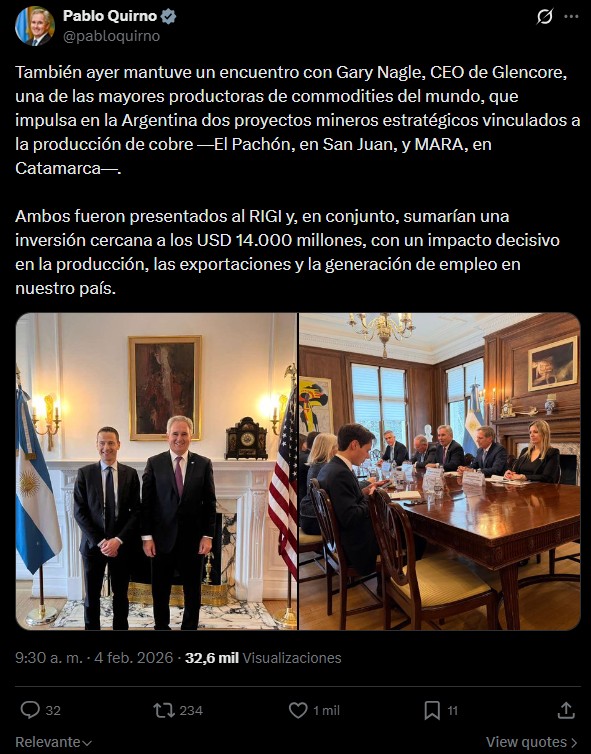 En otra de sus publicaciones, añadió que "también ayer mantuve un encuentro con Gary Nagle, CEO de Glencore, una de las mayores productoras de commodities del mundo, que impulsa en la Argentina dos proyectos mineros estratégicos vinculados a la producción de cobre —El Pachón, en San Juan, y MARA, en Catamarca—".