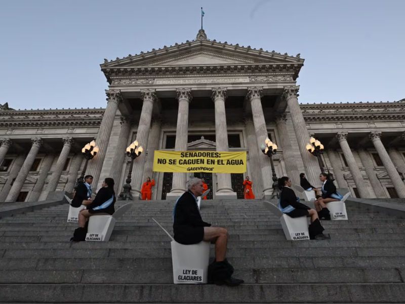 El grupo, que pertenece a la ONG ambientalista Greenpeace, traspasó la reja y colocó inodoros en las escalinatas donde se sentaron a modo de protesta por el debate que se realizará en el Senado y que-de aprobarse- modificará la Ley de Glaciares.