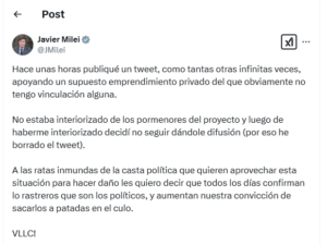 Estallado el escándalo, Milei realizó su descargo: "Hace unas horas publiqué un tweet, como tantas otras infinitas veces, apoyando un supuesto emprendimiento privado del que obviamente no tengo vinculación alguna".