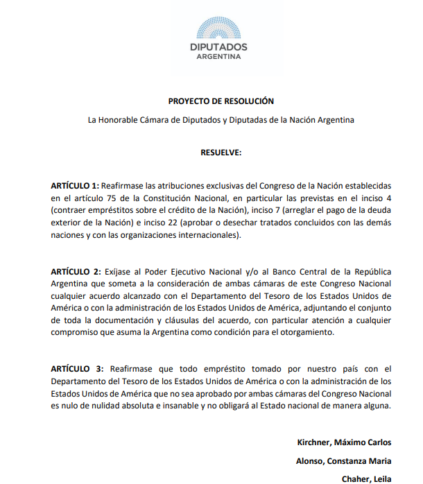 El proyecto conjunto establece la nulidad del préstamo si no se obtiene la aprobación del Congreso y prohíbe recurrir a decretos de necesidad y urgencia para contraer deuda, práctica que se utilizó en marzo de este año para evitar el debate parlamentario.