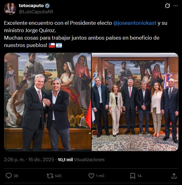 Antes del encuentro, Luis Caputo se refirió a los rumores que dan al actual viceministro suyo José Luis Daza como el titular de la cartera de Economía chilena del Gobierno de Kast. En ese sentido, Caputo admitió ante el programa 'Tiempo Libre', que se emite por La Casa streaming que "obviamente que el presidente electo Kast seguramente ya le ha ofrecido algo". E incluso le tiró flores a su segundo en el Palacio de Hacienda: "José Luis es top class y por encima aún, con lo cual yo le dije 'mirá, hacé lo que el desafío te provoque y lo que más quieras'", aseveró.