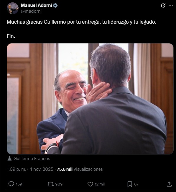Luego de la reunión en el que se pudo percibir mucha cordialidad, Adorni le dedicó un sentido mensaje en sus redes sociales a Francos, donde escribió: "muchas gracias, Guillermo, por tu entrega, tu liderazgo y tu legado". A su vez, esas palabras fueron acompañadas por una fotografía de ambos abrazados, donde puede verse al exministro coordinador sonriente mientras abraza a quien será su sucesor a partir de este miércoles cuando asuma formalmente el cargo prestando el juramente correspondiente.