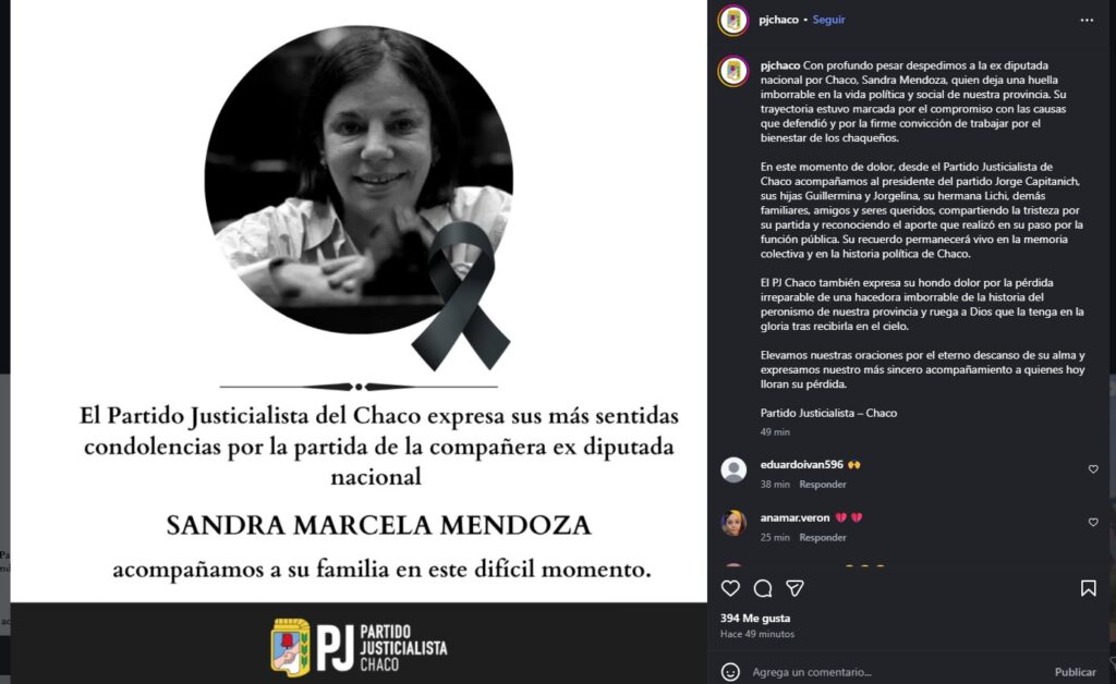Además, "el PJ Chaco también expresa su hondo dolor por la pérdida irreparable de una hacedora imborrable de la historia del peronismo de nuestra provincia y ruega a Dios que la tenga en la gloria tras recibirla en el cielo".