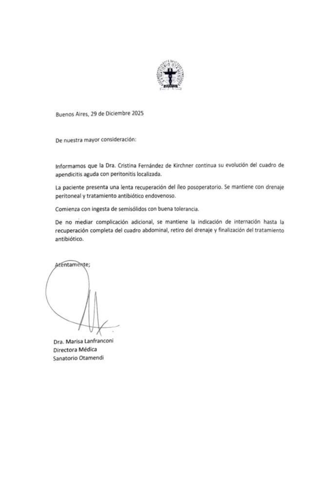 El nuevo comunicado difundido por el Sanatorio Otamendi y que lleva la firma de la doctora Marisa Lanfranconi, directora médica del mencionado nosocomio, detalla que a "la Dra. Cristina Fernández de Kirchner continua su evolución del cuadro de apendicitis aguda con peritonitis localizada. La paciente presenta una lenta recuperación del ileo posoperatorio. Se mantiene con drenaje peritoneal y tratamiento antibiótico endovenoso".