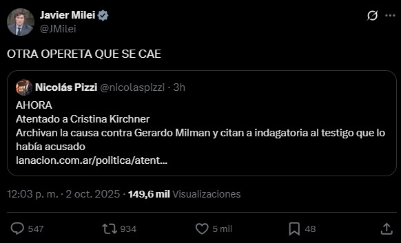 A través de un mensaje en la red social X (exTwitter), el primer mandatario escribió una frase corta pero contundente: "otra opereta que se cae", mientras citó el tuit de Nicolás Pizzi, periodista del diario La Nación donde da detalles de la causa.