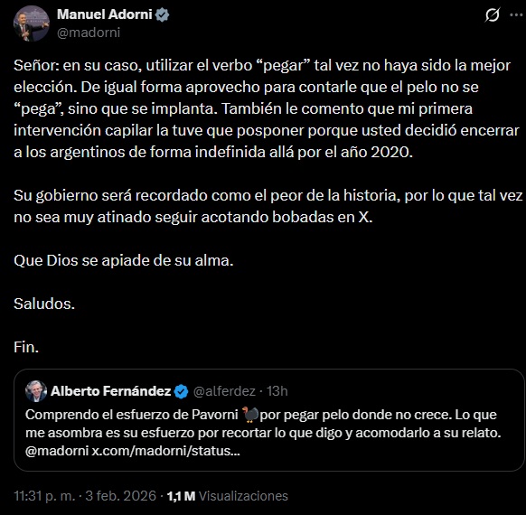 "Señor: en su caso, utilizar el verbo “pegar” tal vez no haya sido la mejor elección. De igual forma aprovecho para contarle que el pelo no se “pega”, sino que se implanta. También le comento que mi primera intervención capilar la tuve que posponer porque usted decidió encerrar a los argentinos de forma indefinida allá por el año 2020. Su gobierno será recordado como el peor de la historia, por lo que tal vez no sea muy atinado seguir acotando bobadas en X. Que Dios se apiade de su alma", agregó un picante Adorni.