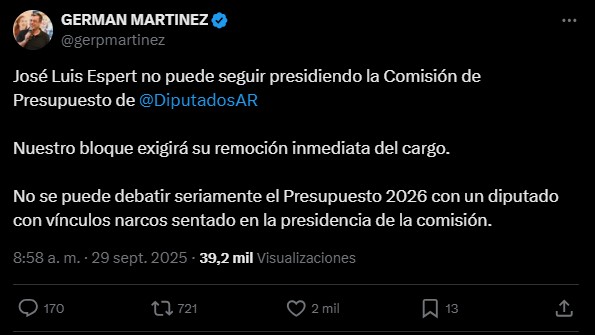 Quien solicitó de manera pública la salida del candidato a legislador por La Libertad Avanza es Germán Martínez, el presidente del bloque de diputados de Unión por la Patria (UxP), quien en su cuenta en la red social X (exTwitter) salió a pedir que Espert de un paso al costado.