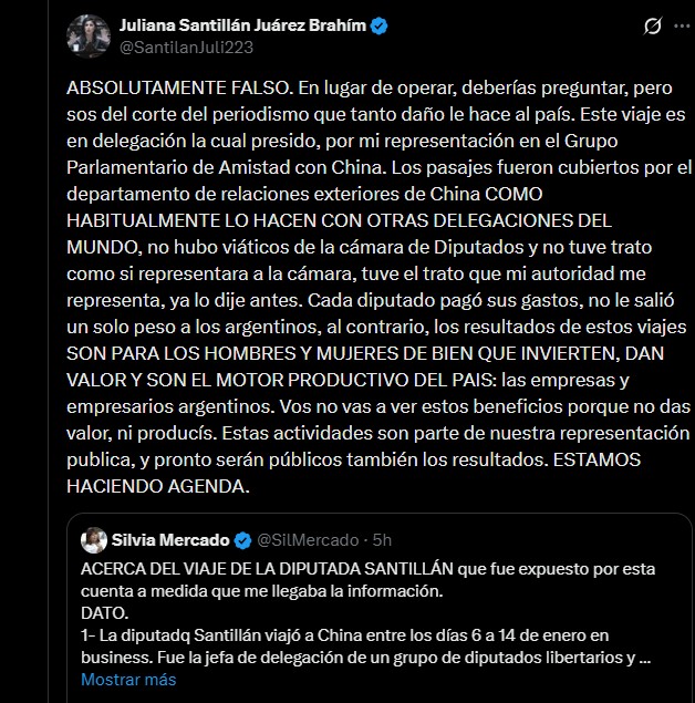 En medio del escándalo, Santillán también le contestó a Mercado y le dijo que "sos del corte del periodismo que tanto daño le hace al país. Este viaje es en delegación la cual presido, por mi representación en el Grupo Parlamentario de Amistad con China".
