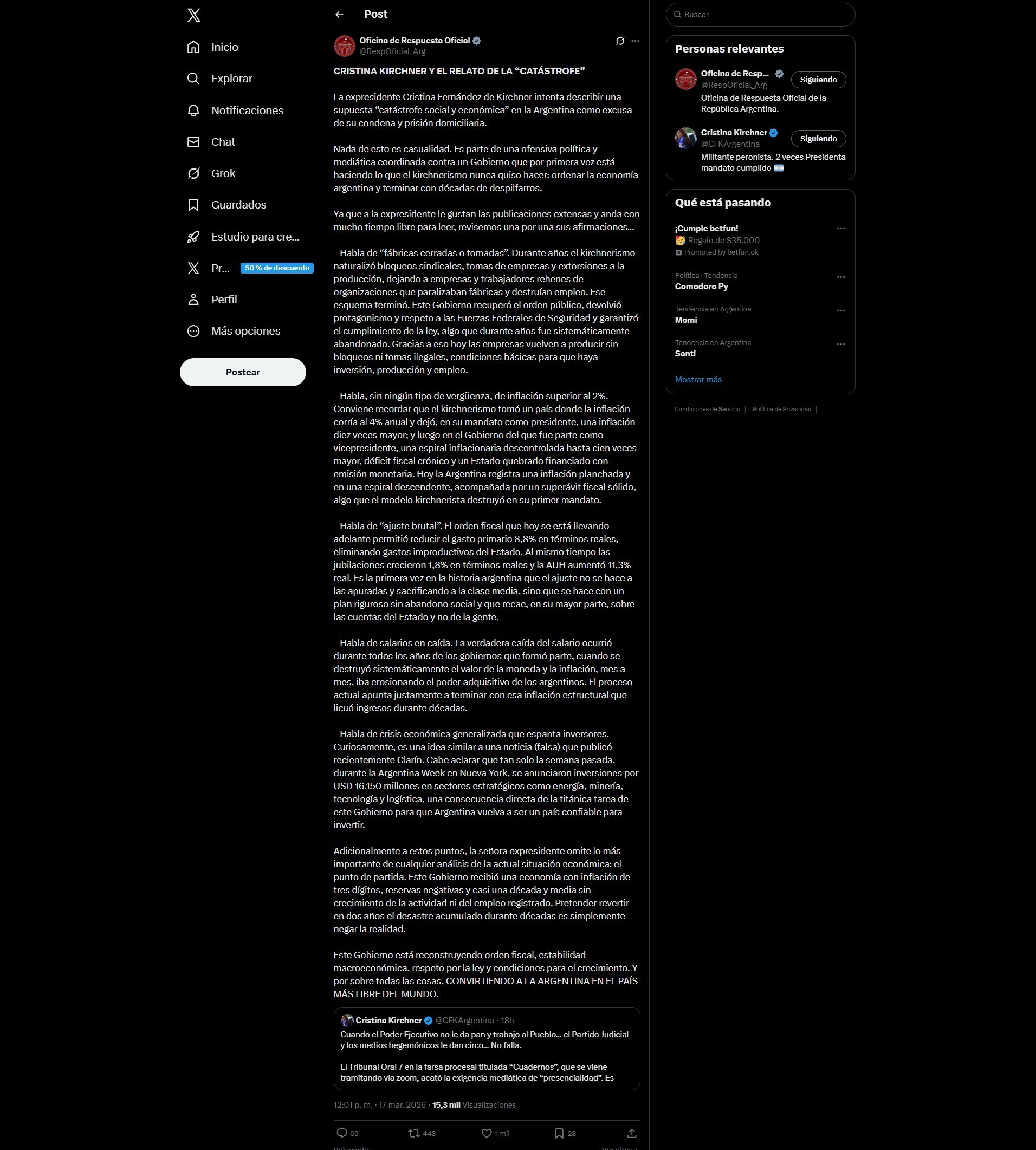 A través de un extenso tuit titulado "Cristina Kirchner y el relató de la 'catástrofe'" donde citan un mensaje que la propia expresidenta escribió ayer, señalaron que "intenta describir una supuesta “catástrofe social y económica” en la Argentina como excusa de su condena y prisión domiciliaria" y agregan que "nada de esto es casualidad. Es parte de una ofensiva política y mediática coordinada contra un Gobierno que por primera vez está haciendo lo que el kirchnerismo nunca quiso hacer: ordenar la economía argentina y terminar con décadas de despilfarros".