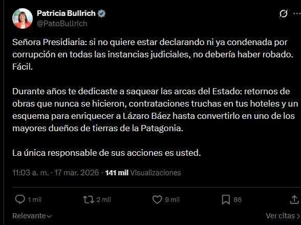 La primera en escribir en su cuenta de X fue la exministra de Seguridad Patricia Bullrich, quien fue directo al hueso: "Señora Presidiaria: si no quiere estar declarando ni ya condenada por corrupción en todas las instancias judiciales, no debería haber robado. Fácil", aseguró.