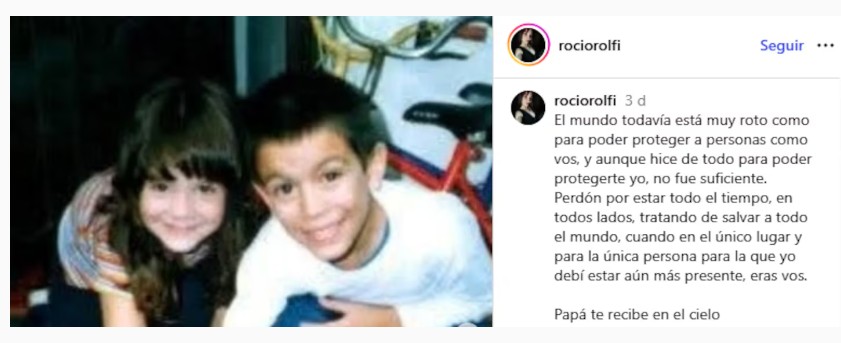 Además, Rocío escribió: "Perdón por estar todo el tiempo, en todos lados, tratando de salvar a todo el mundo, cuando en el único lugar y para la única persona para la que yo debí estar aún más presente, eras vos. Papá te recibe en el cielo", finalizó.