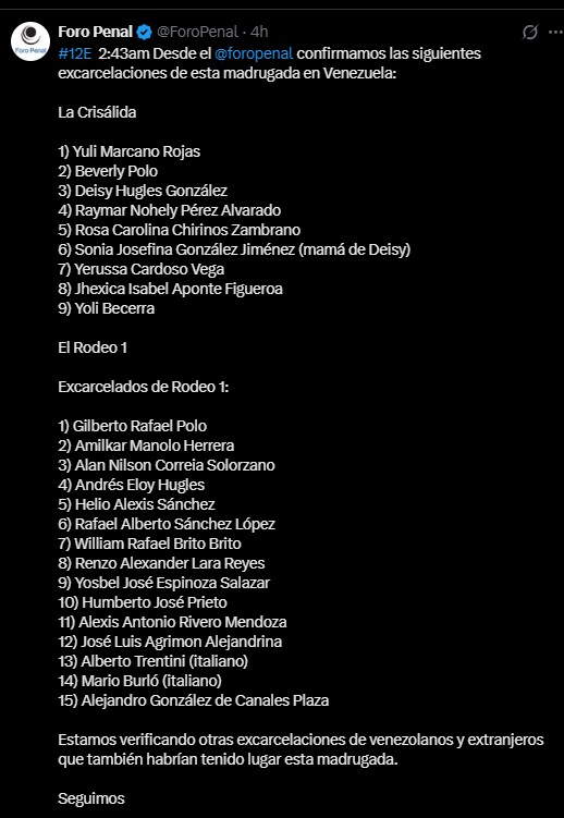 Por otra parte, desde Foro Penal aseguraron que "estamos verificando otras excarcelaciones de venezolanos y extranjeros que también habrían tenido lugar esta madrugada", aunque todavía no brindaron mayores precisiones al respecto.